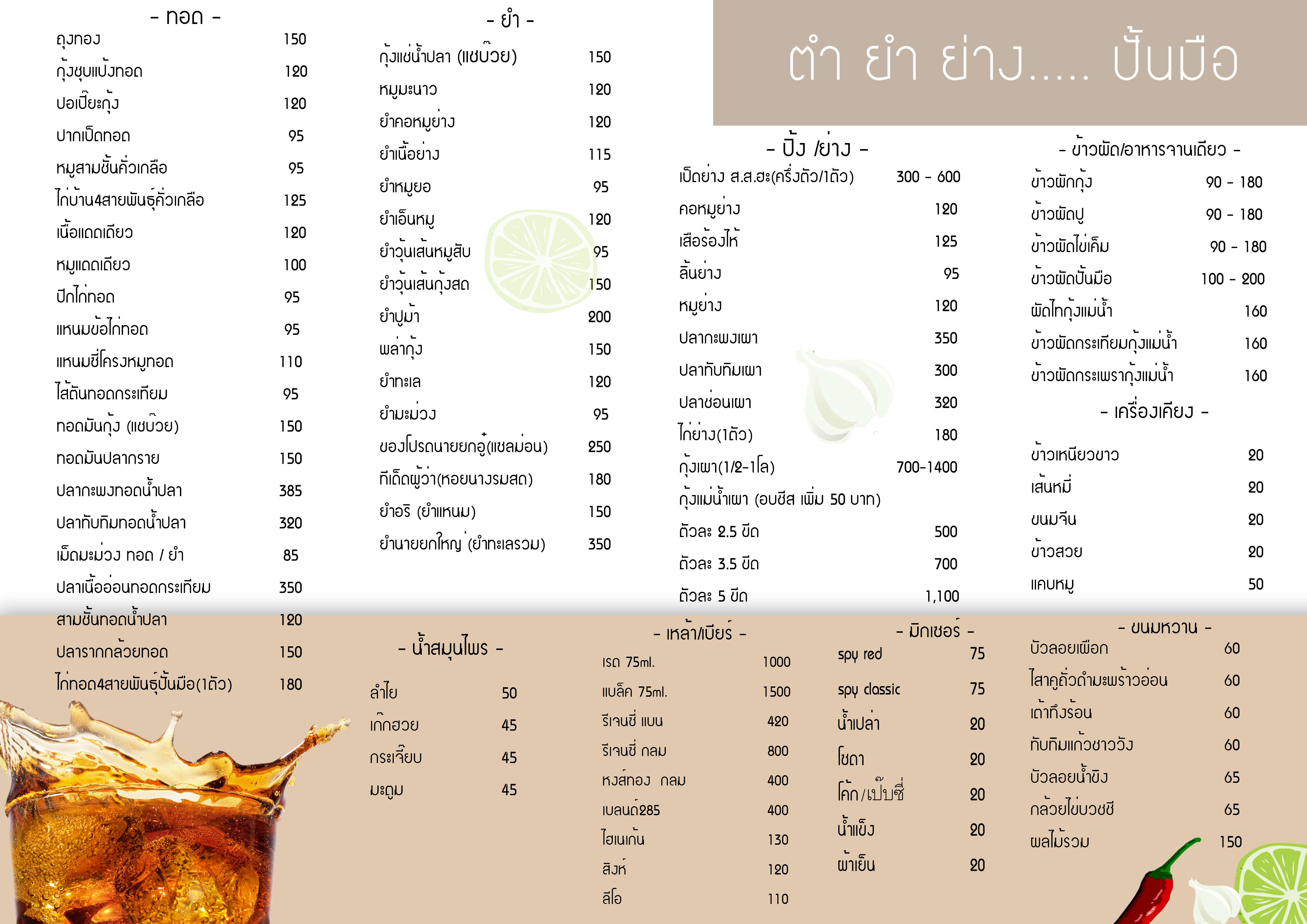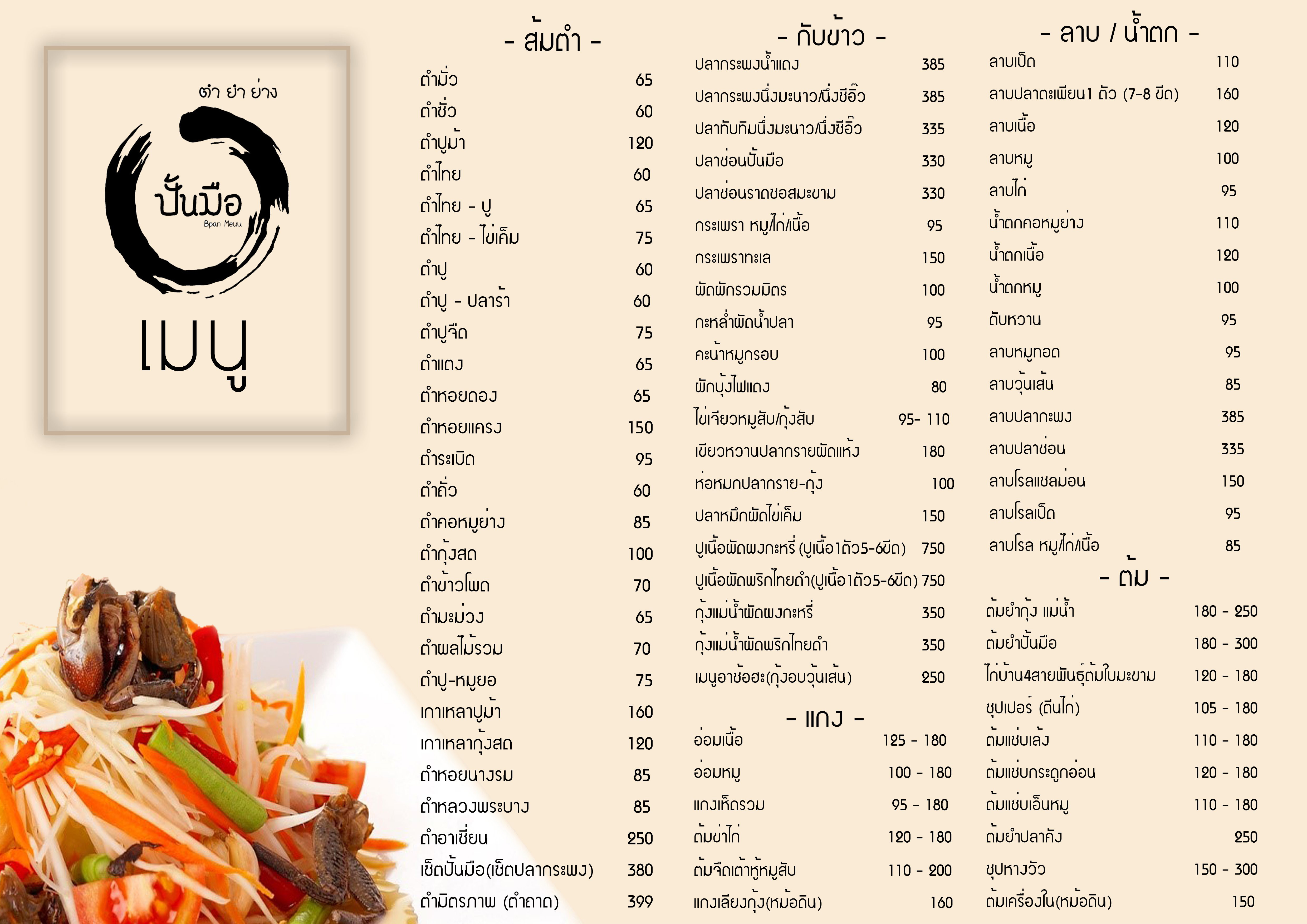 เริ่มกันที่อาหารประเภท ส้มตำ เป็นอาหารที่รู้จักกันดี ไม่ใช่แค่คนในประเทศไทยเราเท่านั้น เรียกได้ว่าเมนูส้มตำเป็นที่รู้จักไปทั่วโลก ซึ่งส้มตำนั้นถือว่าเป็นอาหาร อันดับต้นๆเลยหากเราพูดถึงส้มตำ ต้องคิดถึง ความแซ่บนัว รสชาติที่จัดจาน อันเป็นเอกลักษณ์ของส้มตำ ซึ่งทางร้านปั้นมือของเรานั้นก็มีส้มตำหลากหลายให้ลูกค้าได้เลือกรับประทาน ทั้งส้มตำไทย ตำปูปลาร้า ตำถั่ว ตำแตง ตำซั่ว ตำมั่ว ตำหอยดอง และ ส้มตำอื่นๆ มากกว่า 20 รายการ เฉพาะรายการส้มตำ