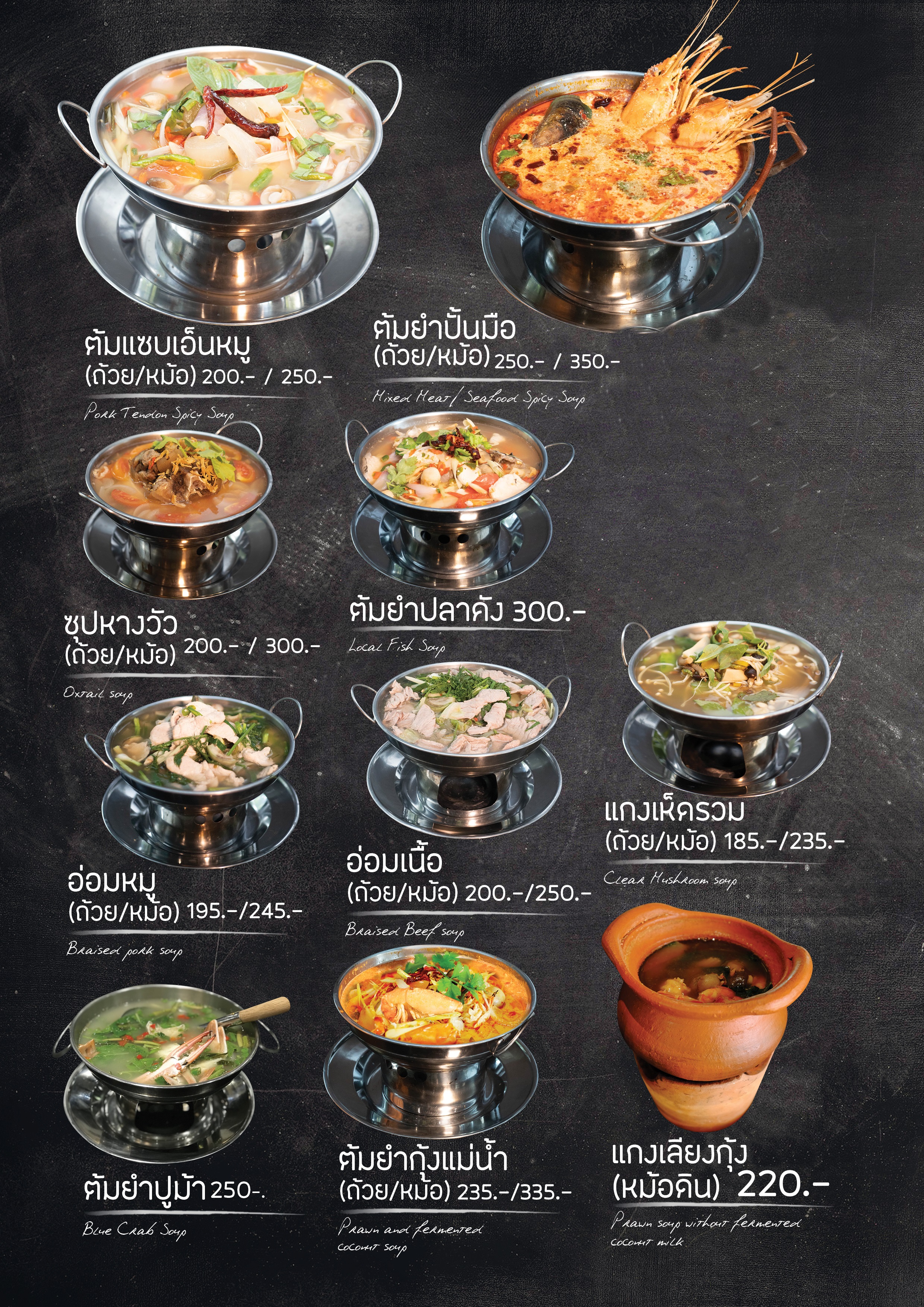 ต้มยำ ต้มแซ่บ ซุปหางวัว ซุปเปอร์ แกงอ่อม และต้มแกงอื่นๆอีกหลายเมนู เมนูต้มแกง คงขาดไม่ได้บนโต๊ะอาหาร คงทานอาหารไม่คล้องคอแน่ หากเราขาดอาหารที่เป็นน้ำๆไป ดังนั้น ร้านปั้นมือของเราก็คัดสรรเมนูต้มแกงมาไว้ให้เลือกมากมาย มีทั้งต้มยำกุ้งที่เป็นอาหารเลื่องชื่อของประเทศไทยที่หลายๆประเทศติดอกติดใจ นอกจานั้นเรายังมี ต้มยำปั้นมือ ต้มยำปลาคัง แกงเลียง และอื่นๆอีกหลากหลาย